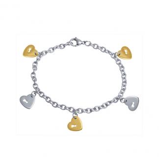 Stainless Steel Bracelet with Heart Charms (with Key Lock Cut Out) In IPG two tone