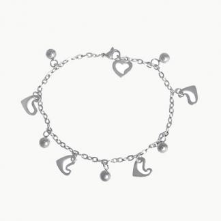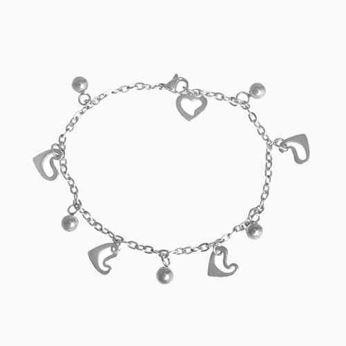 | Stainless steel bracelet with 4 heart charms and 5 beads and a closing heart charm |