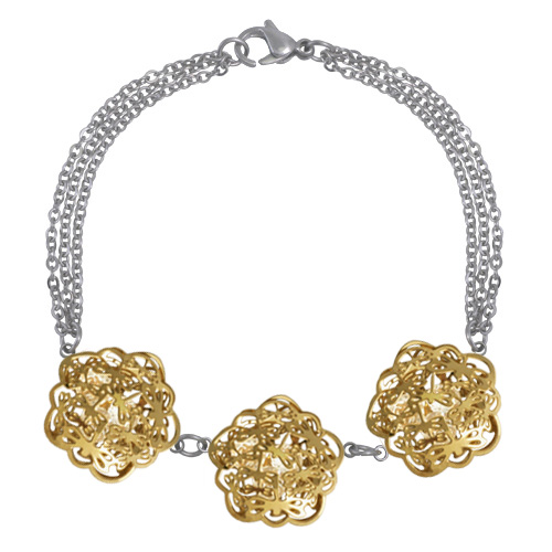 Stainless Steel Bracelet WITH THREE FLOWERS OF DRAGONFLY PATTERN WITH CZ INSIDE IN IPG TWO TONE