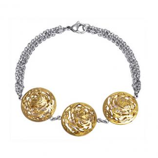 Stainless Steel Bracelet WITH THREE CIRCLES OF ROSE PATTERN WITH CZ INSIDE IN IPG TWO TONE