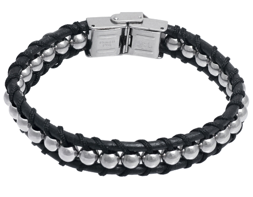 Stainless Steel Bracelet BLACK LEATHER BRACELET WITH BLACK COTTON STRING WITH STAINLESS STEEL BEADS