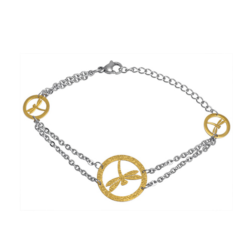 | Stainless Steel Bracelet WITH ONE BIG CIRCLE OF SANDBLAST DRAGONFLY WITH 2 SMALL CIRCLES OF DRAGONFLY IN IPG TWO TONE |