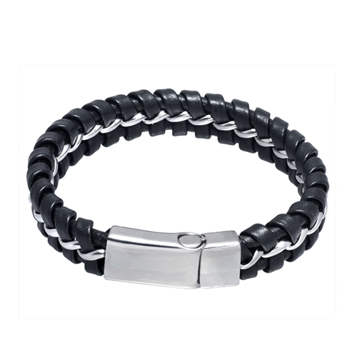 Stainless Steel Bracelet WITH BLACK LEATHER WITH MAGNET LOCK