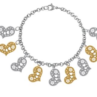 Stainless Steel Bracelet WITH 9 HEART CHARM WITH CLOVER & HEART CUT OUT PATTERN IN IPG TWO TONE