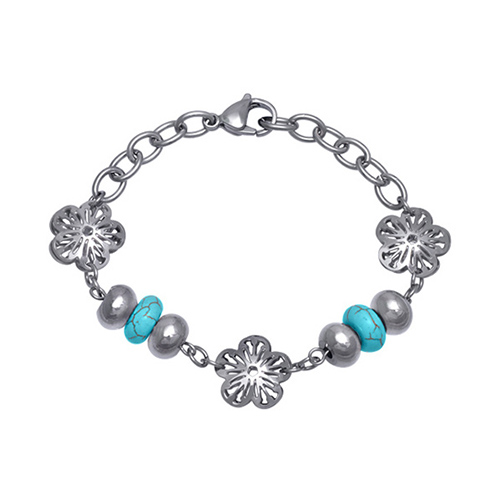 Stainless Steel Bracelet WITH 2 SET OF TURQUOISE AND S/S BEADS WITH 3 FLOWER WITH CUT OUT