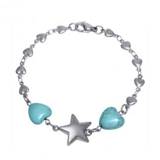 Stainless Steel Bracelet WITH HEART CHAIN WITH 1 STAR IN THE MIDDLE WITH 2 HEART SHAPE TURQUOISE