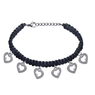 STAINLESS STEEL SHAMBALLA BRACELET WITH BLACK COTTON STRING WITH 6 LOVE HEART CHARMS