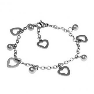 STAINLESS STEEL BRACELET WITH 5 S/S BEADS WITH 4 HEART CHARMS