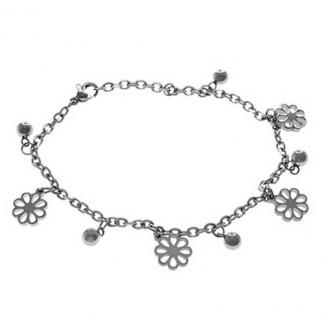 STAINLESS STEEL BRACELET WITH 5 S/S BEADS WITH 4 FLOWERS ALL IN STEEL COLOR
