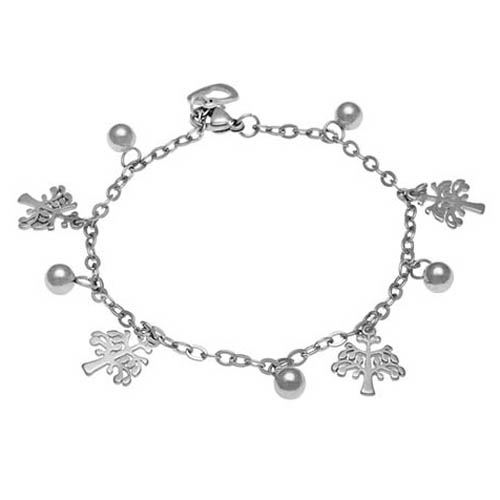 STAINLESS STEEL BRACELET WITH 5 S/S BEADS WITH 4 FLOWERS ALL IN STEEL COLOR