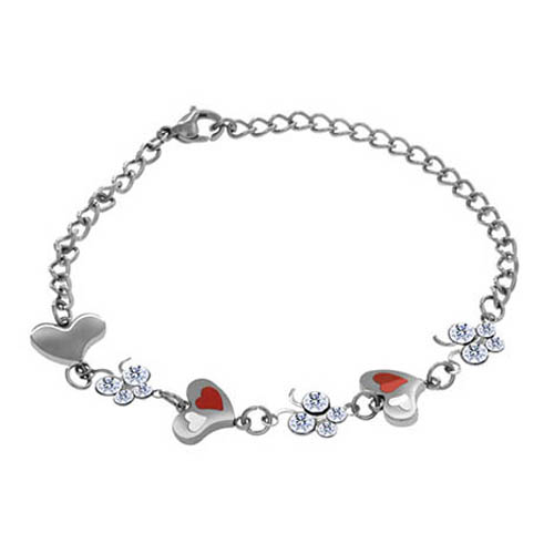 STAINLESS STEEL BRACELET WITH HEART PENDANT IN ENAMEL RED & WHITE WITH BUTTERFLY PENDANT WITH 4 CZ IN STEEL COLOR