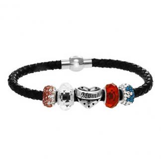 | STAINLESS STEEL BRACELET WITH LEATHER & MAGNET LOCK WITH HEART BEAD IN CENTER WITH 2 ROUND CZ PENDANT WITH RED & WHITE CRYSTAL |
