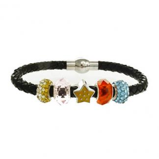 | STAINLESS STEEL BRACELET WITH LEATHER & MAGNET LOCK WITH ENAMEL STAR BEAD WITH 2 ROUND CZ PENDANT WITH RED & PINK CRYSTAL |