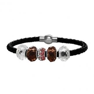 STAINLESS STEEL BRACELET WITH LEATHER & MAGNET LOCK WITH ROUND CZ PENDANT IN CENTER WITH TWO DEEP PINK & TWO WHITE CRYSTAL