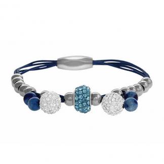 STAINLESS STEEL BRACELET WITH LEATHER & MAGNET LOCK WITH 2 CZ BALLS & S/S BEADS & 4 GREEN BEADS WITH BLUE CRYSTAL