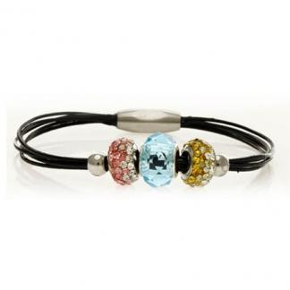 STAINLESS STEEL BRACELET WITH BLACK LEATHER STRAND WITH S/S MAGNET LOCK WITH BLUE CRYSTAL WITH 2 COLORFUL ROUND CZ PENDANT WITH 2 S/S BEADS