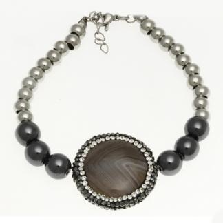 STAINLESS STEEL BRACELET WITH BROWN STONE WITH BLACK & WHITE CZ WITH 6 BLACK BEADS & S/S BEADS CHAIN