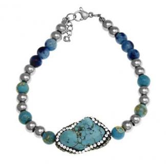 STAINLESS STEEL BRACELET WITH TURQUOISE STONE IN THE CENTER WITH BLACK & WHITE CZ AROUND IT WITH BLUE & S/S BEADS S/S COLOR
