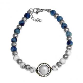 STAINLESS STEEL BRACELET WITH BIG PEARL CENTER PIECE WITH BLACK & WHITE CZ AROUND IT WITH WHITE & BLUE & S/S BEADS S/S COLOR