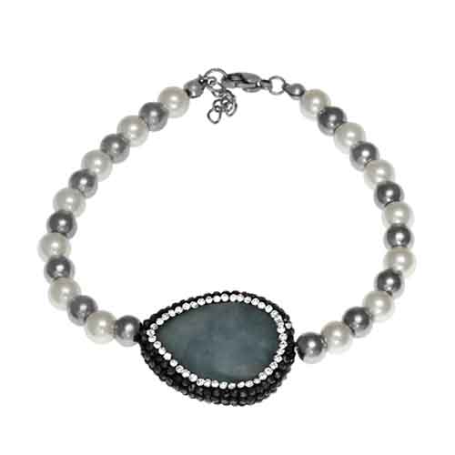 STAINLESS STEEL BRACELET WITH BLUE SMOK STONE WITH BLACK & WHITE CZ AROUND IT WITH PEARLS & S/S BEADS S/S COLOR
