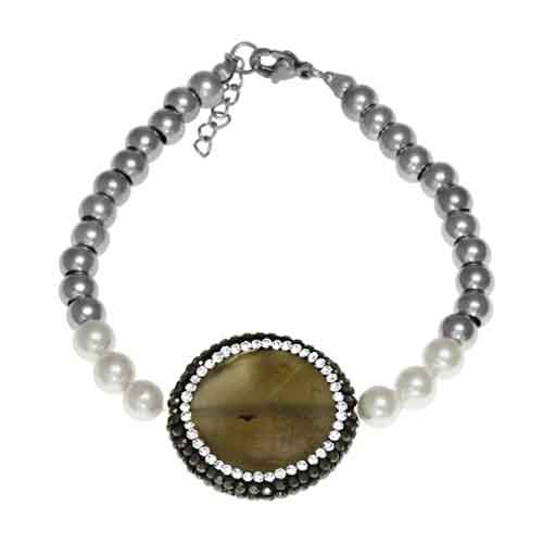 STAINLESS STEEL BRACELET WITH BROWN STONE CENTER PIECE WITH BLACK & WHITE CZ AROUND IT & 6 PEARLS & S/S BEADSS/S COLOR