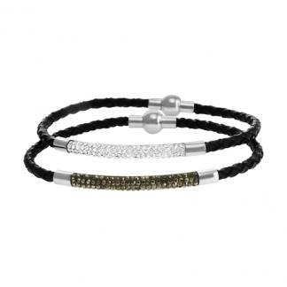 STAINLESS STEEL BRACELET WITH LEATHER AND CENTRE PIECE WITH CZ.