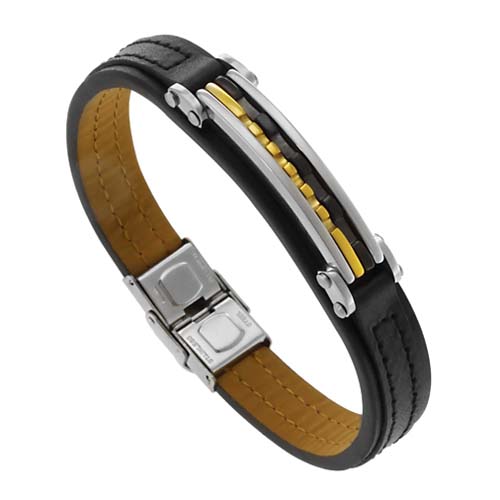 STAINLESS STEEL BRACELET WITH BROWN LEATHER / IN SS IPG IPB 3 TONES