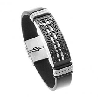 STAINLESS STEEL BRACELET WITH BLACK LEATHER. THE ID PLATE IN IPB TWO TONE