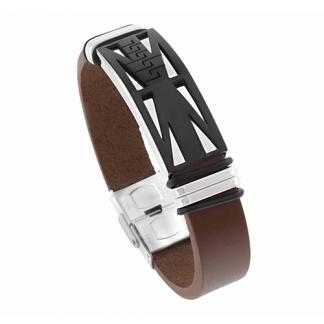 STAINLESS STEEL BRACELET WITH BROWN LEATHER. THE ID PLATE IN IPB TWO TONE