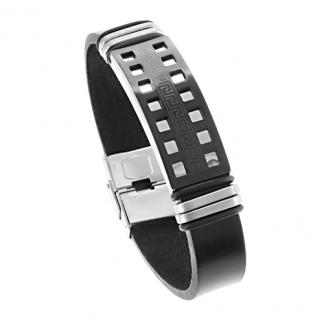 STAINLESS STEEL BRACELET WITH BLACK LEATHER. THE ID PLATE IN IPB TWO TONE