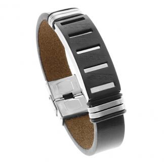 STAINLESS STEEL BRACELET WITH BLACK LEATHER. THE ID PLATE IN IPB TWO TONE