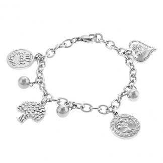 STAINLESS STEEL BRACELET WITH 4 CHARMS IN DIFFERENT DESIGNS AND 3 STEEL BALL IN 8MM. THE HANGING CHARMS SIZES FROM 12MM-18MM WIDTH