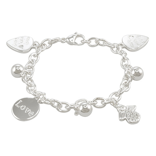 STAINLESS STEEL BRACELET WITH 4 CHARMS IN DIFFERENT DESIGNS AND 3 STEEL BALL IN 8MM. THE HANGING CHARMS SIZES FROM 12MM-18MM WIDTH