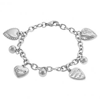 STAINLESS STEEL BRACELET WITH 4 CHARMS IN DIFFERENT DESIGNS AND 3 STEEL BALL IN 8MM. THE HANGING CHARMS SIZES FROM 12MM-18MM WIDTH