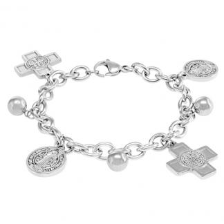 STAINLESS STEEL BRACELET WITH CROSS & SAN BENITO CHARMS ALL IN SS COLOR.