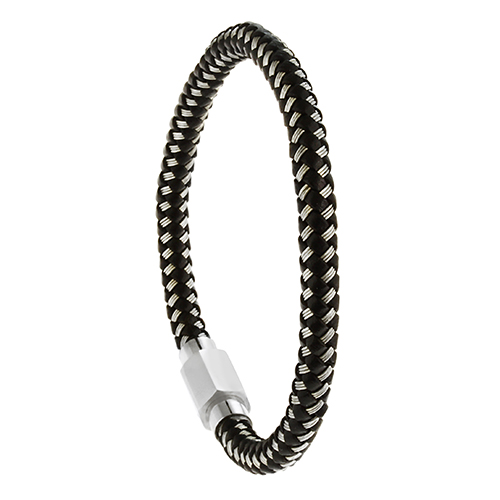 STAINLESS STEEL BRACELET WITH BLACK LEATHER WITH WIRE IN SS COLOR WITH MAGNET LOCK