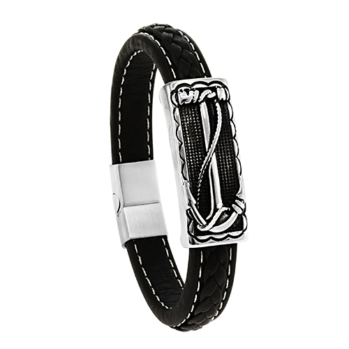 STAINLESS STEEL LEATHER BRACELET WITH ONE ID PLATE IN THE CENTER