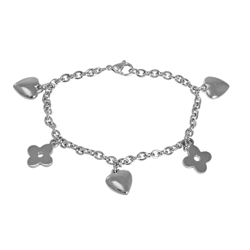 Stainless Steel Bracelet WITH FLOWER & HEART CHARMS ALL IN STEEL COLOR