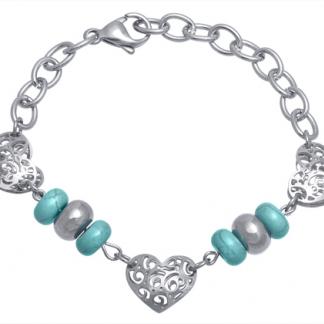 Stainless Steel Bracelet WITH 3 HEARTS WITH CUT OUT PATTERN WITH S/S BEADS AND TURQUOISE STONE