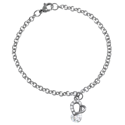 Stainless Steel Bracelet WITH HEART SHAPE CHARM WITH ONE BIG CZ & SMALL CZ ALL IN STEEL COLOR