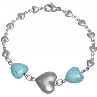 | Stainless Steel Bracelet WITH HEART CHAIN WITH 1 HEART IN THE MIDDLE WITH 2 HEART SHAPE TURQUOISE |