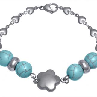| Stainless Steel Bracelet WITH HEART CHAIN WITH 1 FLOWER IN THE MIDDLE WITH 2 SETS OF TURQUOISE STONE & S/S BEADS |