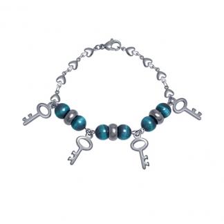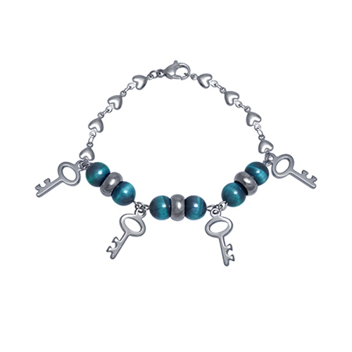 Stainless Steel Bracelet WITH HERAT CHAIN WITH 4 KEY CHARM WITH 3 SET OF BLUE GREEN STONES & STAINLESS STEEL BEAD