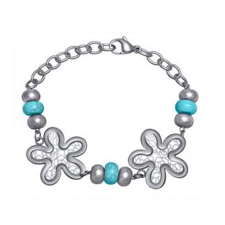 Stainless Steel Bracelet WITH 3 SET OF TURQUOISE AND S/S BEADS WITH 2 FLOWER WITH CUT OUT