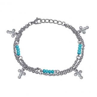 Stainless Steel Bracelet (TWO CHAINS IN ONE)WITH 4 CROSS CHARM WITH 3 SETS OF TURQUOISE STONE