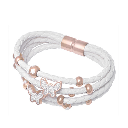 | STAINLESS STEEL STRAND BRACELET IN WHITE PU WITH 2 BUTTERFLY WITH 3 FLOWER BEAD AND 10 BEAD WITH CRYSTAL STONE WITH MAGNET LOCK ALL IN IP ROSE COLOR |