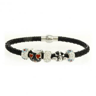 STAINLESS STEEL BRACELET WITH LEATHER & MAGNET LOCK WITH TURTLE BEAD WITH CAT BEAD WITH 3 ROUND CZ PENDANT
