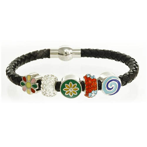 | STAINLESS STEEL BRACELET WITH LEATHER & MAGNET LOCK WITH 1 ENAMEL FLOWER BEAD WITH 2 ENAMEL ROUND BEAD WITH 2 ROUND CZ PENDANT |