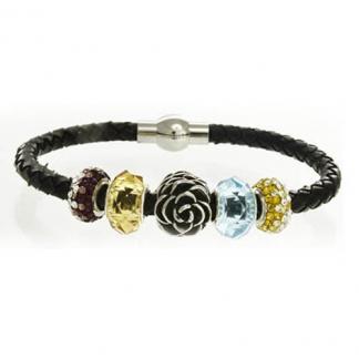 | STAINLESS STEEL BRACELET WITH LEATHER & MAGNET LOCK WITH ROSE BEAD WITH 2 ROUND CZ PENDANT WITH BLUE & YELLOW CRYSTAL |
