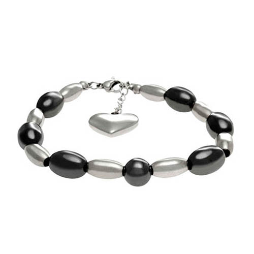 STAINLESS STEEL BRACELET WITH BLACK & S/S OVAL BEADS WITH HEART CHARMS